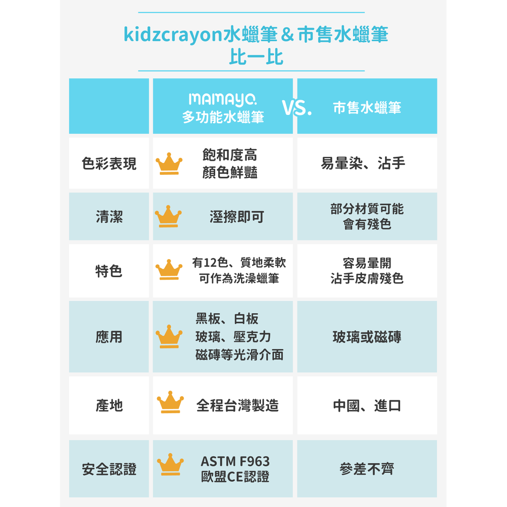 台灣無毒繪畫領導品牌 超好清潔玻璃浴室牆壁隨處你畫! 伸縮水洗筆管節省用量 幼兒專用無毒蠟筆,顯色容易、安全無毒 適用年齡:3歲以上 洗澡必備,光滑平面可擦 Kidzcrayon伸縮水洗蠟筆,又稱作洗澡蠟筆,不沾手不油膩,全程台灣生產製造,色彩飽和度高,可用於光滑的浴室磁磚或是牆壁,使用濕抹布即可擦拭完成,讓孩子盡情地玩耍,是我們的使命,如果擔心孩子把牆壁塗得亂七八糟,是專為幼兒設計的一款無毒蠟筆 規格:12色/ 1盒入 商品成分:水性蠟、蜜蠟、色粉、碳酸鈣 商品尺寸(裸筆):長8.3cm / 直徑0.8cm / 支 商品尺寸(含筆芯):長9.6cm / 直徑1.2cm / 支 外盒尺寸:22x12.5x1.3cm 產地:台灣 適用年齡:3歲以上